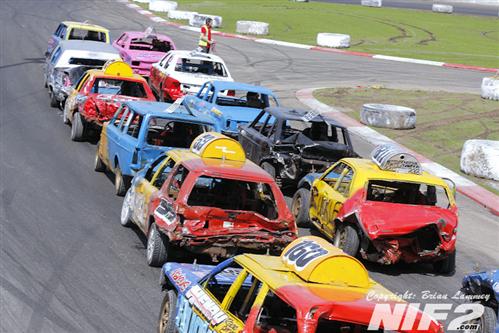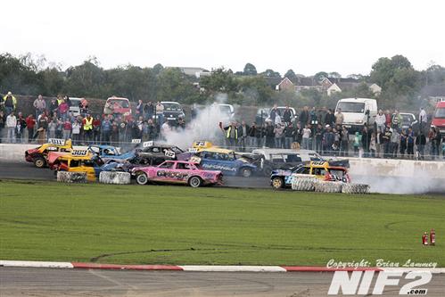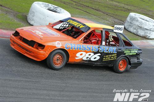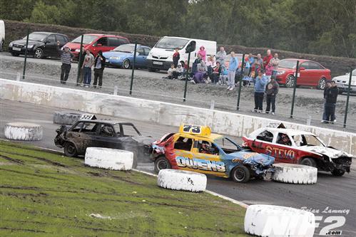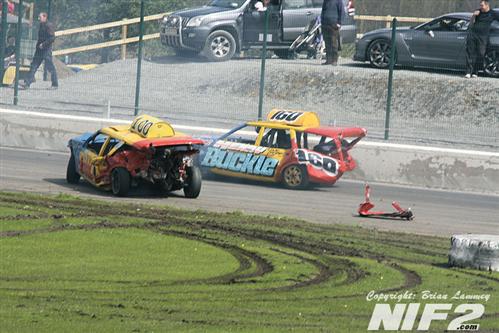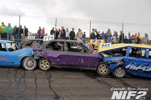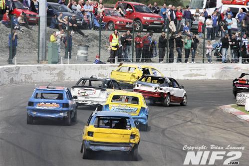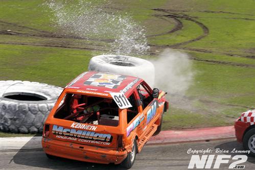 Team Buckle dominated the Unlimited National Banger Irish Open and going into the closing stages held all five of the top places. Booboo snatched defeat from the jaws of victory by running out of petrol on the last lap in his superbly turned out Mk 2 Granada, which I’m informed is quite rare tin, although I passed one on the Westlink on my way to the racing on Saturday so there must be the odd one or two knocking about. David Owens eventually took the honours. The Bangers all comers race was won by Willy Ogilby and a lively Destruction derby went to Darren Gaffney and Stevo McGrath as they both went out in the last action of the day.