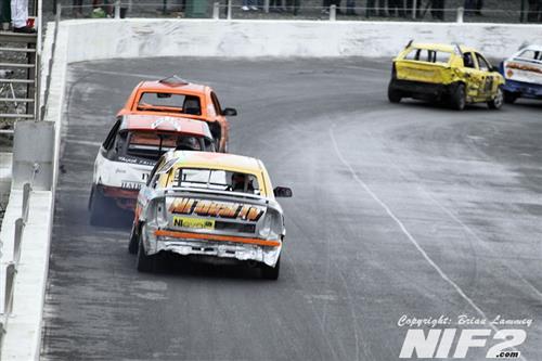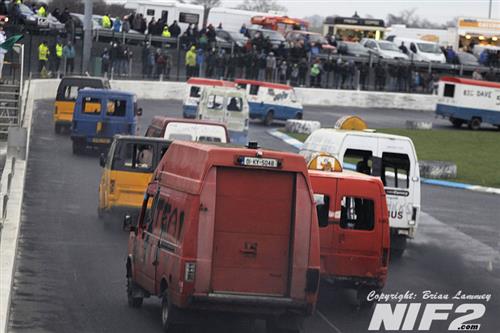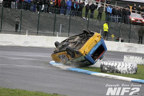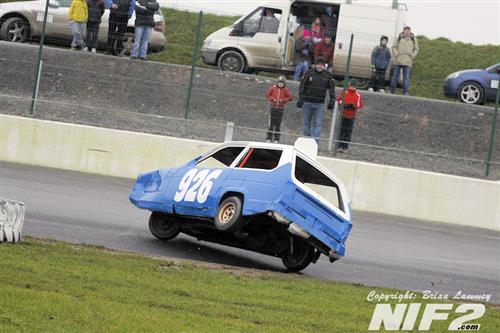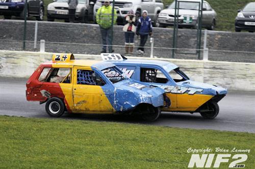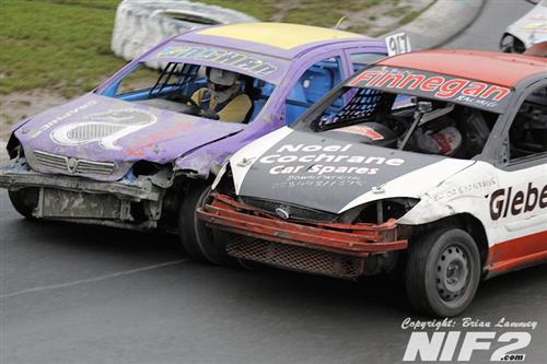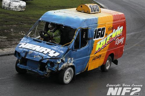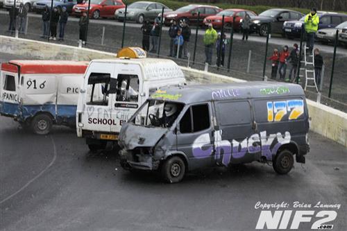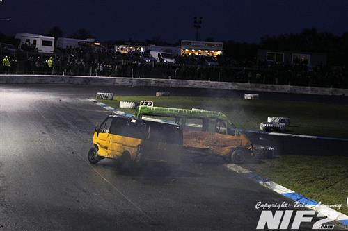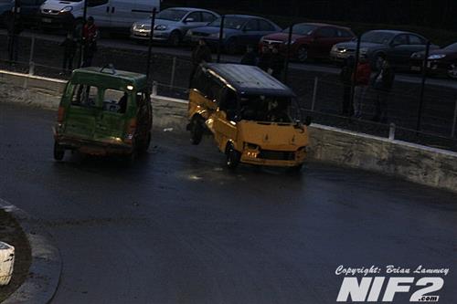 The festive meeting at Tullyroan and Nuttscorner Oval before it means an outing for the Big Van bangers and the Reliant Robins Irish Championship. It's almost just as traditional now that Ian Bolton wins the Robins and this year was no exception, although mid race it looked as though Billy McClean could well take the Green and White Cheq roof. Bolton went on to take the win in the Revenge race.