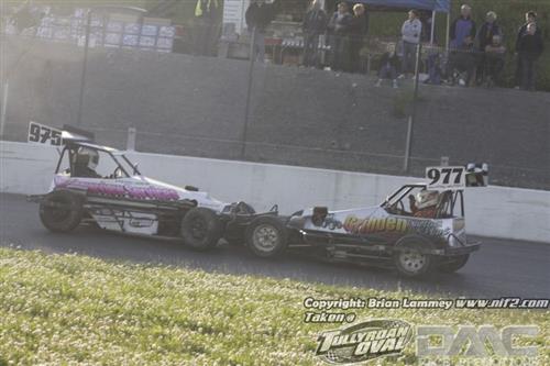 Matthew Nicholl also took a heat and final double in the Ninja Karts which featured a few close races. Kenny Robinson won all three in the Lightning Rods. Jay Jay McConaghie took a heat and final double in the Robins, which included a big roll for Rachel McMillan. In the Superstox there was an opening heat win for Denver Grattan, Gregg Hyndman just about held off a big last bend lunge from Gavin Fegan to take heat two and Ryan McClure took his first win in the class in the final, and won it comfortably too, collecting a tyre from NIOvalTV for the effort.