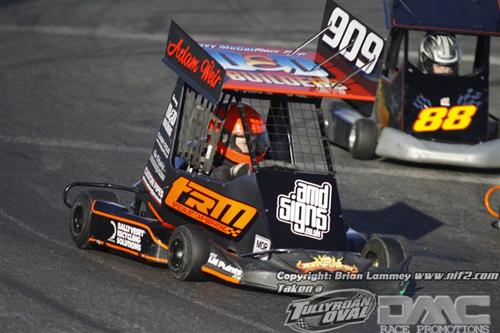 In quite contrasting conditions to Friday night’s meeting at Aghadowey, the Sunday afternoon meeting at Tullyroan took place mostly in bright sunshine and quite nice light for taking photos, something there wasn’t a lot of in the summer, let alone something you’d expect in mid October. A shower ahead of the meeting dampened the conditions for the opening heats and may have played it’s part in the Ninja Karts Championship too. With the Juniors, Lightning Rods and 2.0 Hot Rods on track ahead of the Karts, the track was a drying track with a few wet lines, but nearly every kart on the grid was out on wets and it looked like an inspired choice of slicks from Callum Magill’s camp may have given him an edge over those around him.