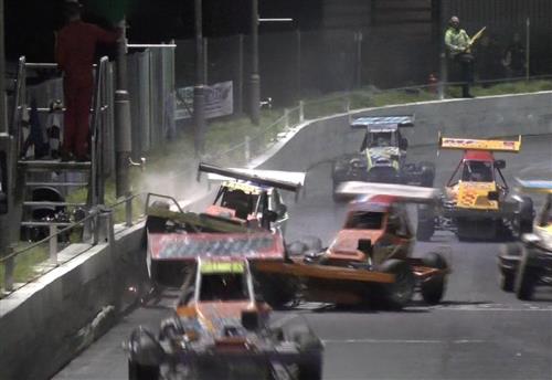Somehow between the previous meeting and the Irish meeting I’d got it into my head it was a good idea to take the revenge race from the front of the reversed Irish grid, that it would be time to step forward and take whatever was coming, somehow my mind hadn't recalibrated that I’d spun on two of the three excursions that night and perhaps while I’m still guessing settings it would be better to cruise around at the back, so I ended up starting the revenge race on pole. Forgetting everything I’d ever learnt about Stockcar racing I led a fairly quick rolling lap (as I was in second not wanting to miss a gear from the front) and waited and waited for the green, when it came I was already being pushed broadside towards the infield before getting caught up with Gary Grattan and going back out to the wall before coming to rest in turn one with the wheels locked together, getting free’d and then retreating to the infield with a fairly mangled front upright. It was one of the shorter races I’ve taken part in, but I got hit, I got half spun, I went up the wall and wrecked a wheel, for 100 yds of track I’d put a lot of things you could fear behind me.