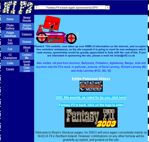 I built my first website. Rob Speak won the BriSCA F1 title. Ian Thompson and Gavin Fegan took the majority of the final wins but ended up tangled in the fence in the Irish Open, and Alistair Calvin won the Stock Rod World final. Here is a look back at 2001